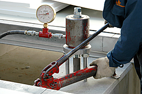 3種類のM16のアンカーを上向きに施工し、金属拡張アンカー引張耐力30kN、接着系アンカーは40kN以上を合格点としています。 | |||||||||||||
